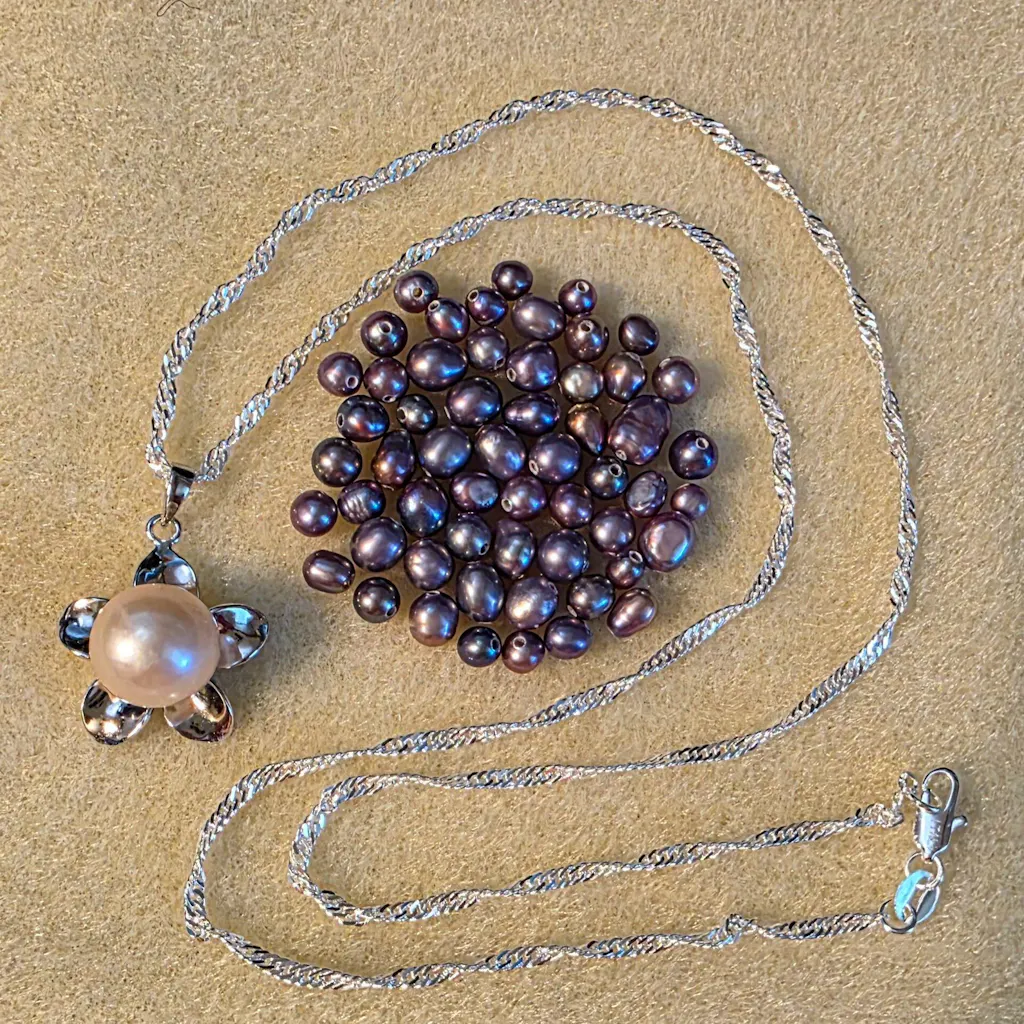 When my husband brought the package of pearls I fell in love with the light pink pearls. It was such a treat to find the necklace behind the bag of pearls, that I am looking forward to being able to place another order soon.